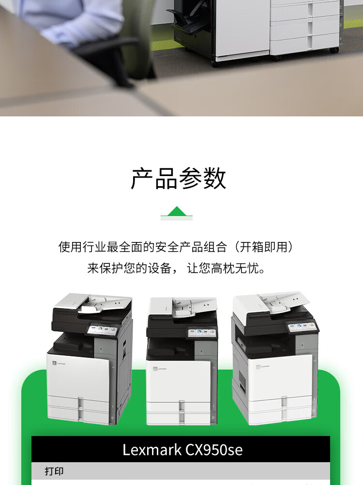 全新 利盟 (Lexmark ) CX950se彩色多功能一體機融合尖端科技,以安全可靠的多功能性、優異卓越的可持續性和超乎想象的易用性,為您開啟 A3 多功能打印的新篇章。逼真的打印效果,最高 25 頁/分鐘* 的打印速度,助您多快好省完成工作。25 厘米彩色觸摸屏直觀易操作,單通道雙面掃描輕松省時間。